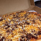 Pizza sauce, cheese, bacon, ham, sausage, pepperoni and hamburger.